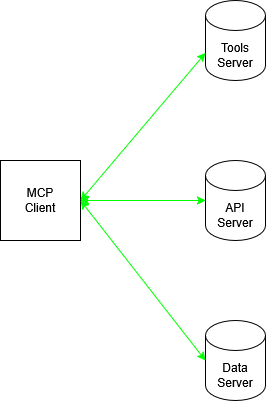 MCP leverages client-server architecture. The servers expose different tools to clients. Any one client can have multiple server connections.